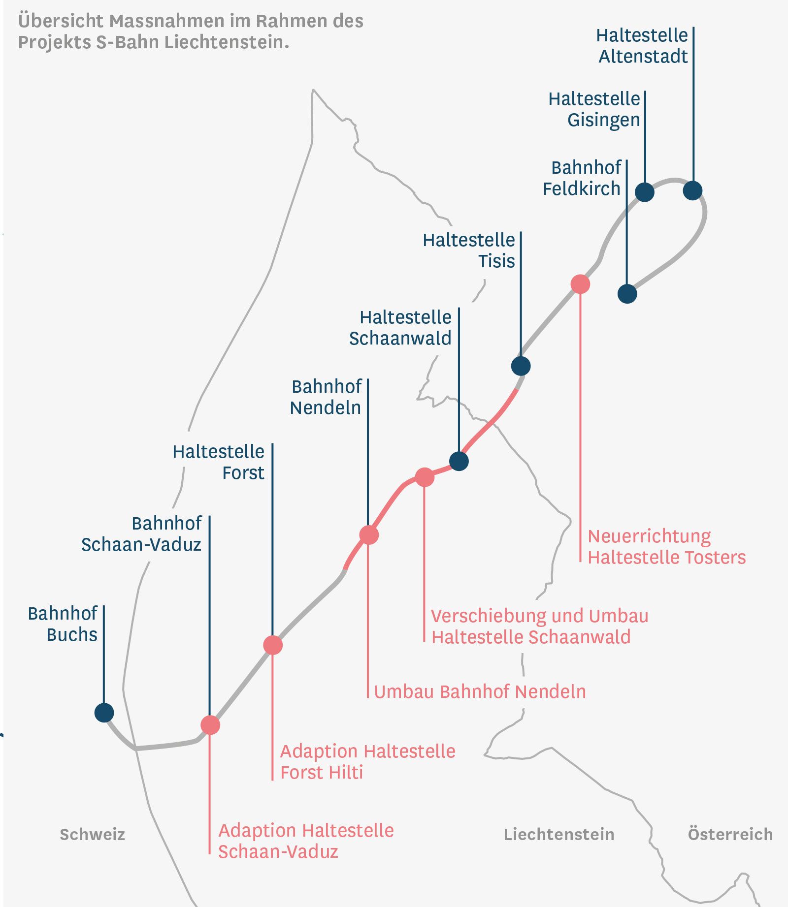 Zusätzlich zum Doppelspurausbau zwischen der Staatsgrenze zu Österreich und dem Bahnhof Nendeln beinhaltet das Leitprojekt eine Reihe von flankierenden Massnahmen wie den Neubau der Überführung in Schaanwald, den Neubau bzw. die Modernisierung und den Ausbau von Haltestellen, den Bau einer Strassenunterführung in Nendeln zur Auflösung des Knotenpunkts Engelkreuzung sowie Optimierungen für den Langsamverkehr und wirkungsvolle Lärmschutzmassnahmen.