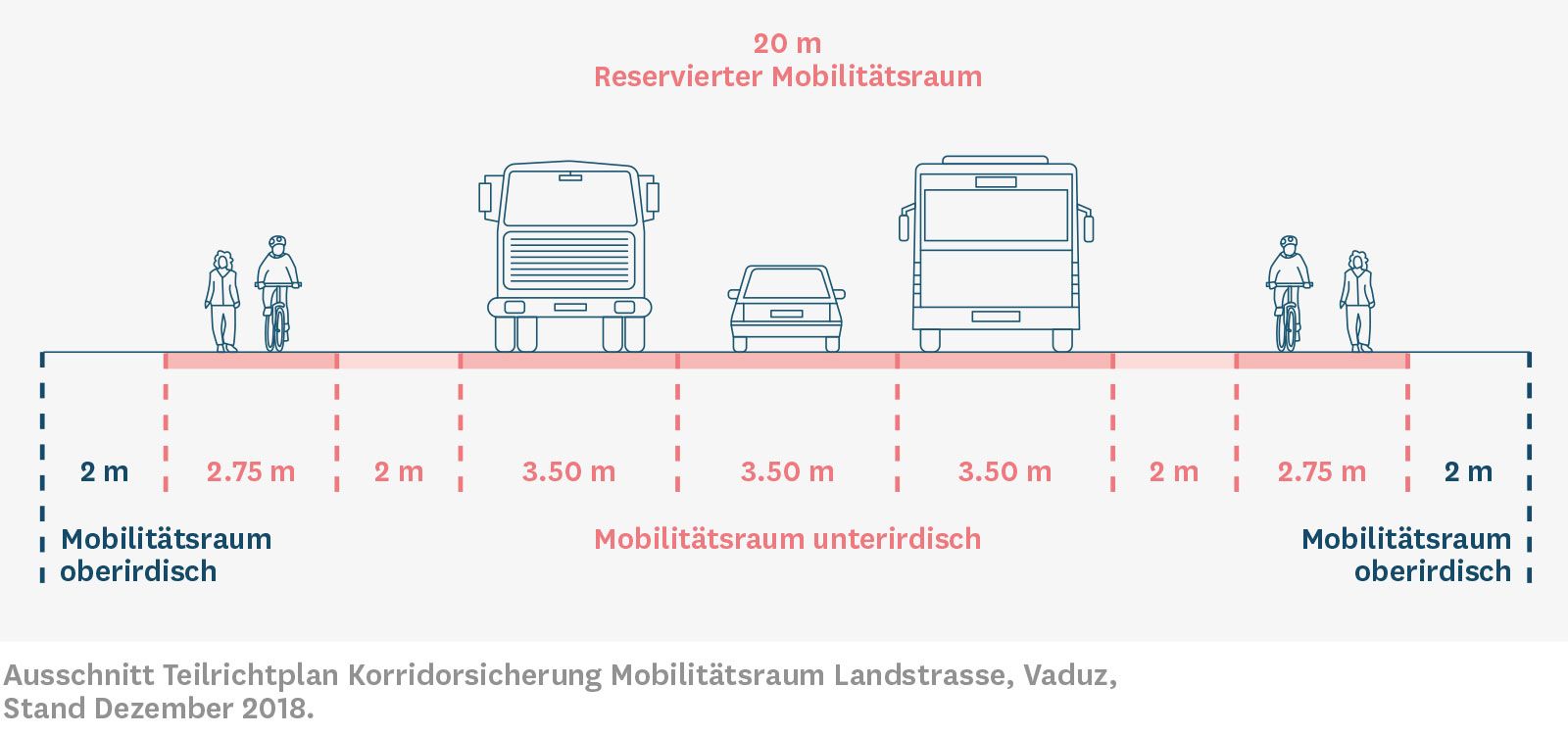 Die Platzverhältnisse auf den Hauptverkehrsachsen, insbesondere im Bereich der Ortsdurchfahrten, sind beschränkt. Der Raum reicht in besonders stark belasteten Ortszentren wie beispielsweise in Schaan oder Vaduz nicht aus, um gleichzeitig die steigenden Raumbedürfnisse des motorisierten Individualverkehrs, des öffentlichen Verkehrs sowie des Fuss- und Radverkehrs befriedigen zu können. Für sämtliche Landstrassen sollen daher Mobilitätskorridore in Zusammenarbeit zwischen Land und Gemeinden festgelegt und gesichert werden.